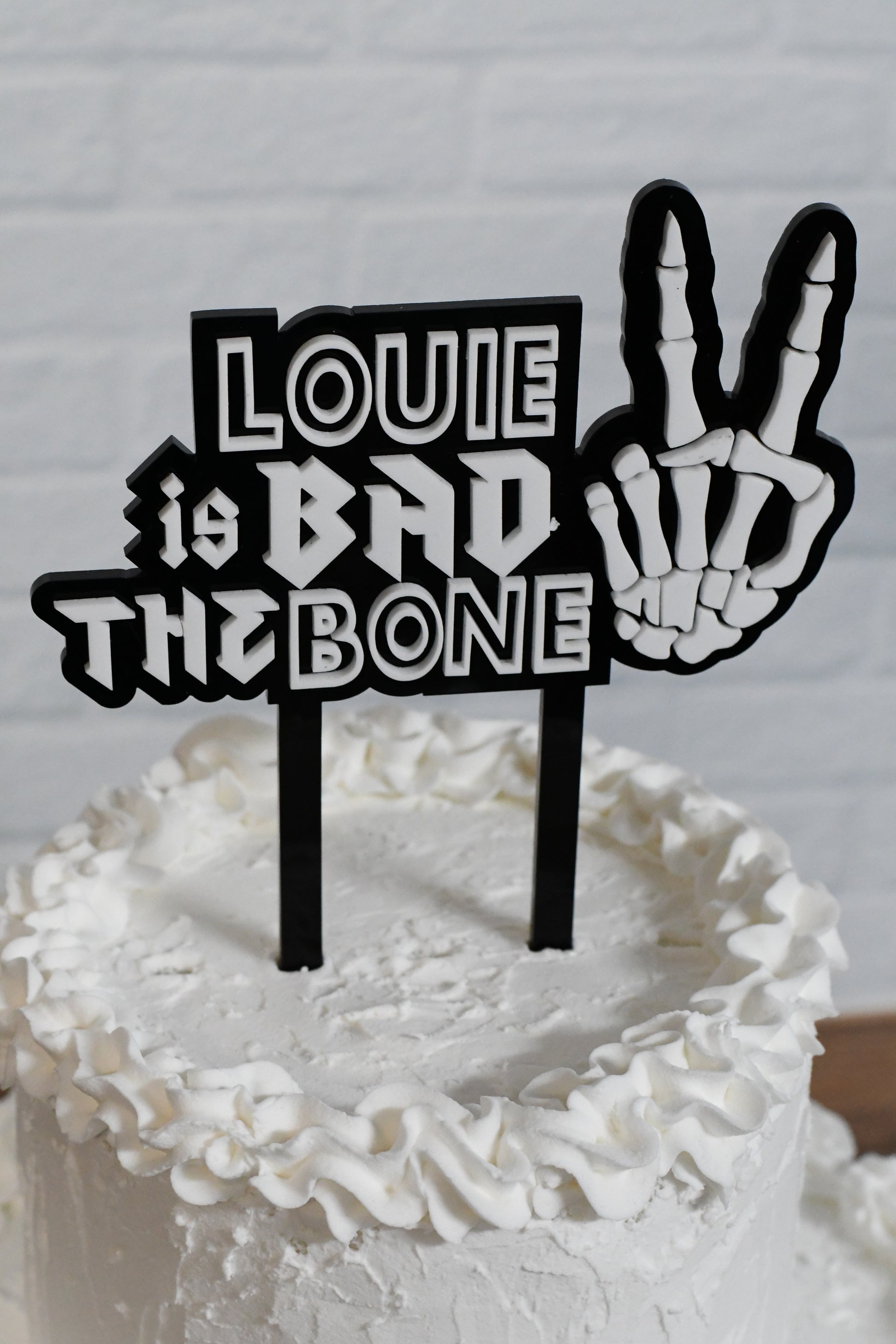 Bring edgy birthday vibes with this "Bad 2 the Bone" cake topper-- complete with a skeleton peace sign for the coolest celebration ever.