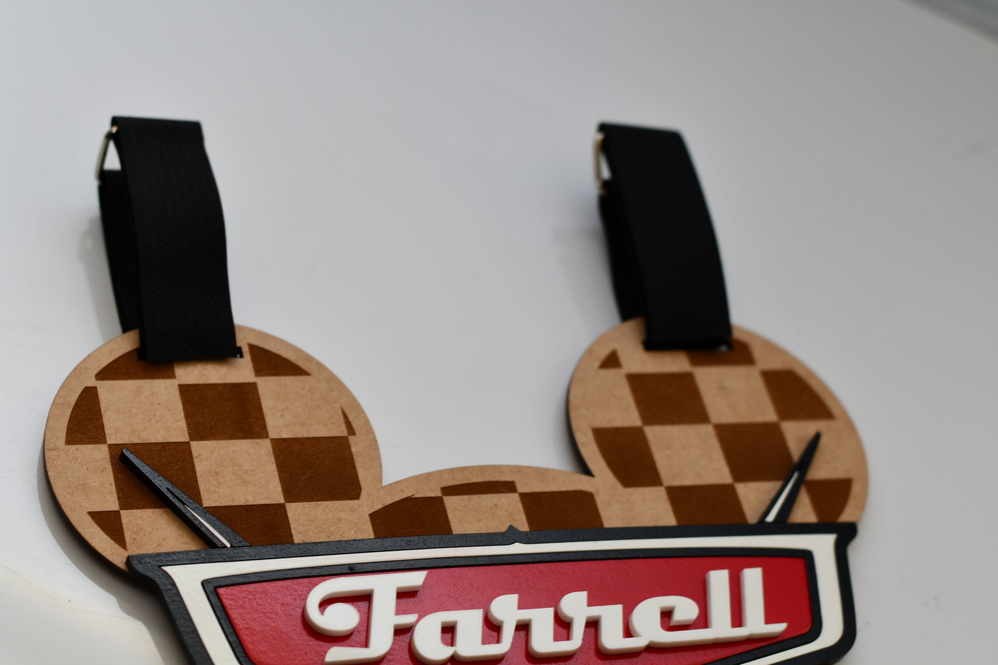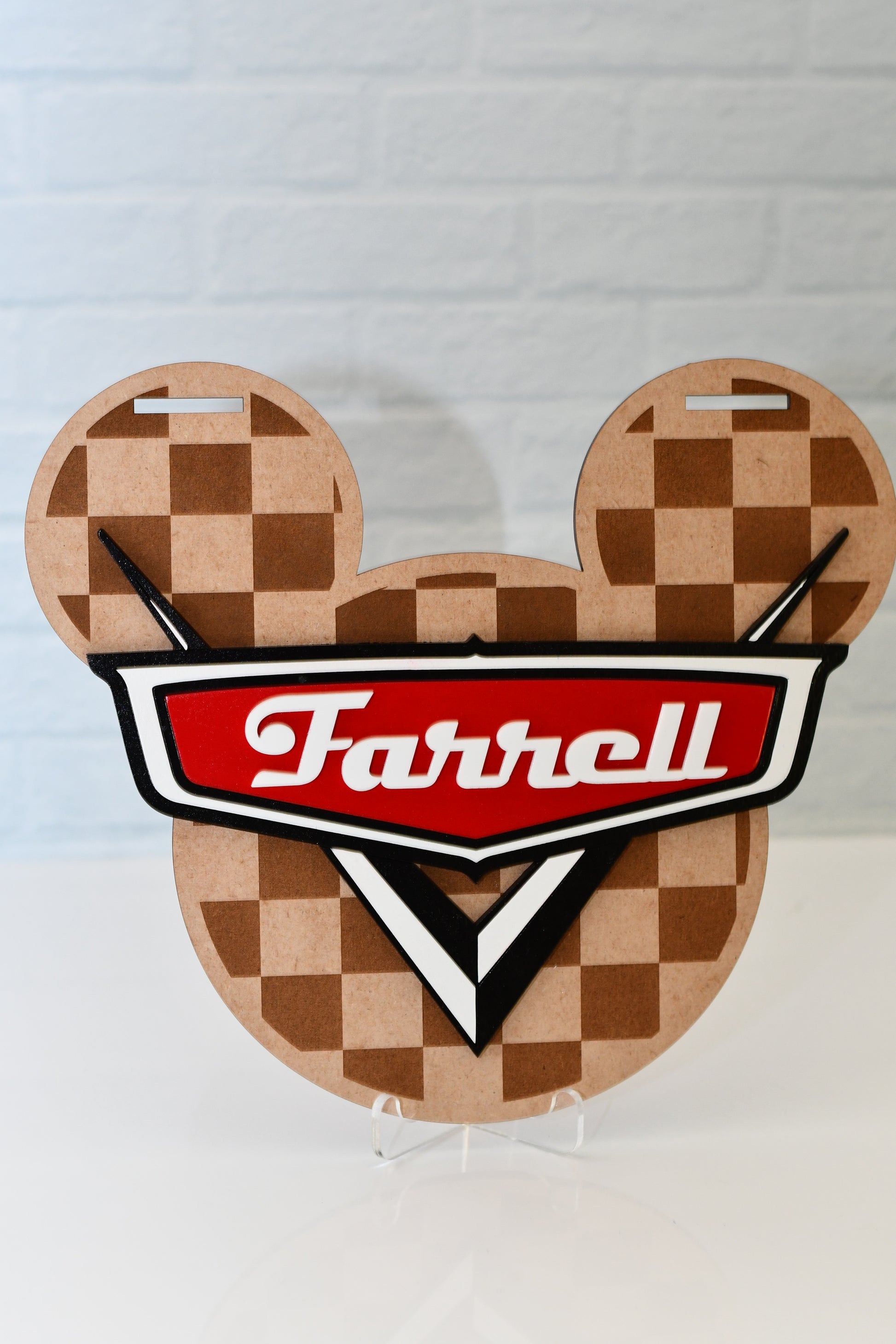 Make your stroller the star of the park! Custom Cars-themed name tag in a Mickey silhouette, perfect for adding personality and easy stroller ID.